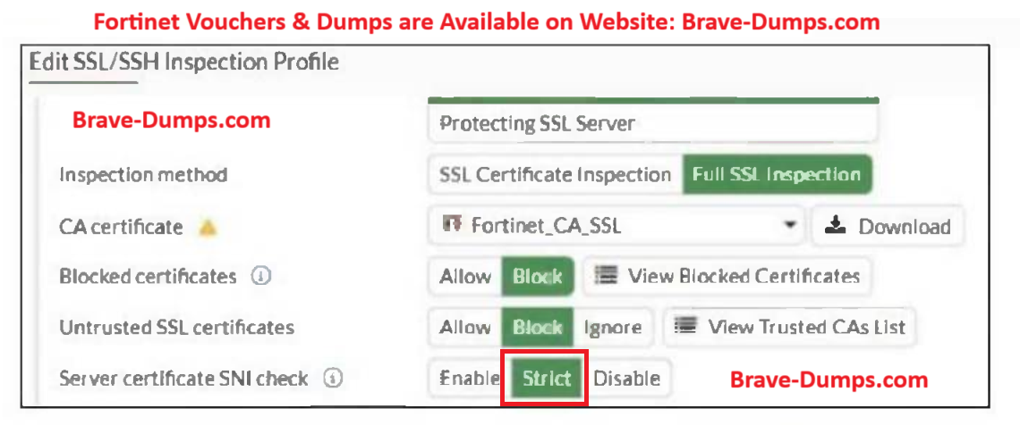Refer to the exhibit. What would be the impact of these settings on the Server certificate SNI check configuration on FortiGate? (Choose one answer)