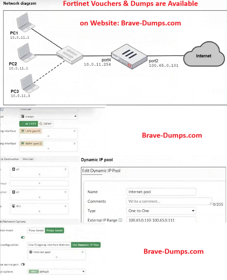 Refer to the exhibits. The exhibits show a diagram of a FortiGate device connected to the network, as well as the firewall policy and IP pool configuration on the FortiGate device. Two PCs, PC1 and PC2, are connected behind FortiGate and can access the internet successfully. However, when the administrator adds a third PC to the network (PC3), the PC cannot connect to the internet. Based on the information shown in the exhibit, which two configuration options can the administrator use to fix the connectivity issue for PC3? (Choose two answers)