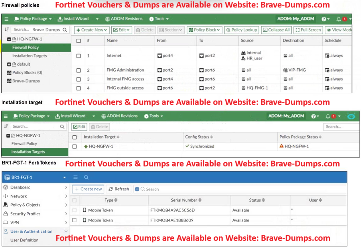 Refer to the exhibits. An administrator needs to push a FortiToken Mobile to assign it to HR_user in the HQ-NGFW-1. However, when installing the policy package, they receive the following error message: Copy device global objects Vdom copy failed: error -999 - Copy objects for vdom root "firewall policy", "1", id=5532, COMMIT FAIL - invalid value - prop[user fortitoken]: Mobile FortiToken FTFKMO84A9AC5C56D used by user local HR_user could not be found at device "user local", "FTKMOB4A9AC5C56D", id=5586, COMMIT FAIL - invalid value - prop[user fortitoken]: Mobile FortiToken FTFKMO84A9AC5C56D used by user local HR_user could not be found at device Why is the administrator not able to install the FortiToken on the HQ-NGFW-1 firewall? (Choose one answer)