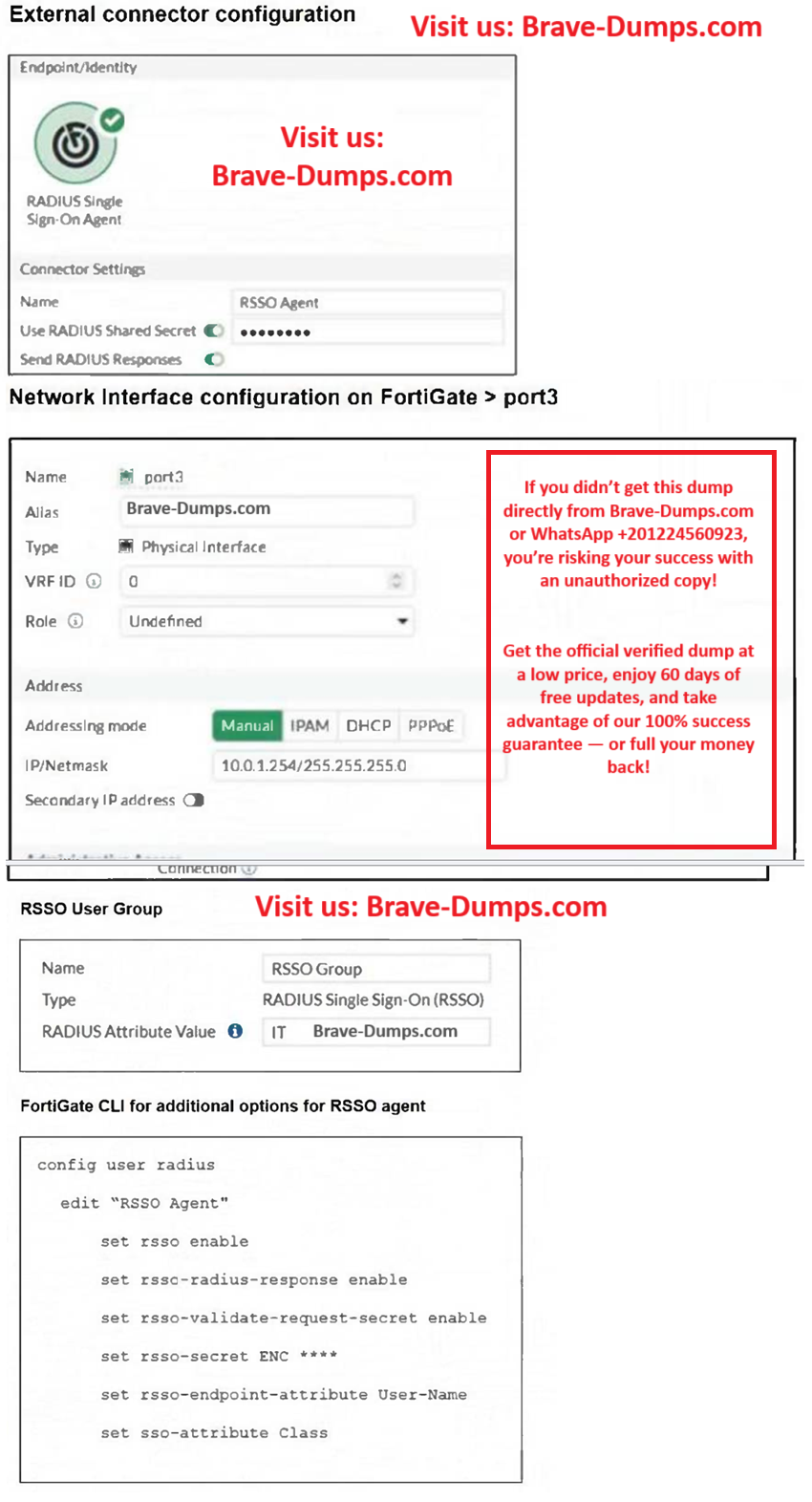 Refer to the exhibits. You have configured RADIUS single sign-on (RSSO) on a FortiGate device, ensuring that all settings are correct and the integration with the RADIUS server is correctly established. Communication between FortiGate and the RADIUS server is happening through port3. After testing, you notice that while user authentication and RSSO activity are functioning as expected, the RADIUS server does not display session logs or detailed usage information. What is the most likely reason for this issue? (Choose one answer)