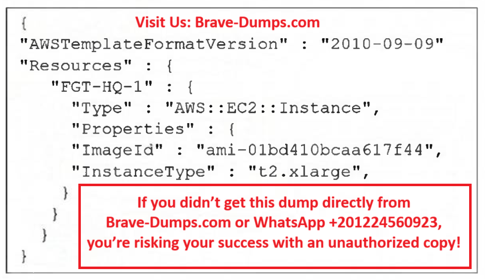 The exhibit shows a JSON format template (indicated by the curly braces and syntax structure). Since JSON does not support comments, the administrator would need to convert it to YAML format to add the required comment about changing the AMI ID for different regions.