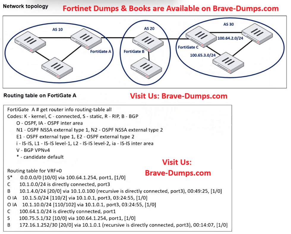 D -> to redistribute routes on FortiGate_B learned from FortiGate_C (via BGP peering between FortiGate_B and FortiGate_C) to FortiGate_A (via BGP peering between FortiGate_A and FortiGate_B), also doesn't restrict it to only 100.64.2.0/24 as requested, so it's wrong