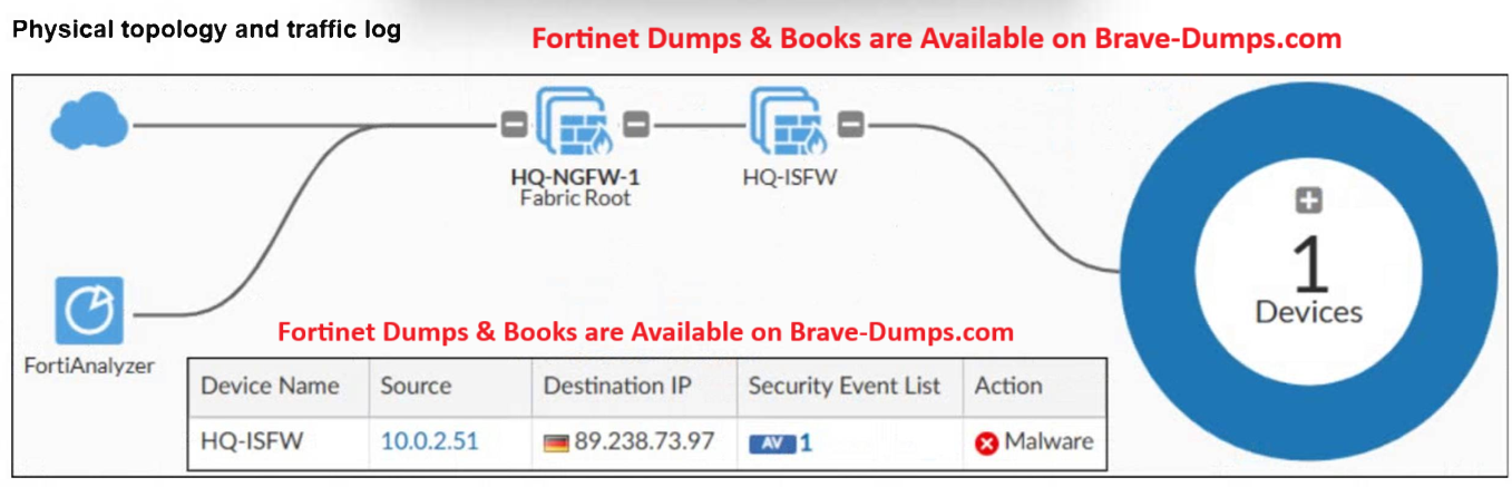 A physical topology along with a traffic log is shown. You are using FortiAnalyzer to monitor traffic from the device with IP address 10.0.2.51, which is located behind the FortiGate internal segmentation firewall (ISFW) device. Unified threat management (UTM) is not enabled in the firewall policy on the HQ-ISFW device, and you are surprised to see a log with the action Malware, as shown in the exhibit. What are two reasons why FortiAnalyzer would display this log? (Choose two answers)