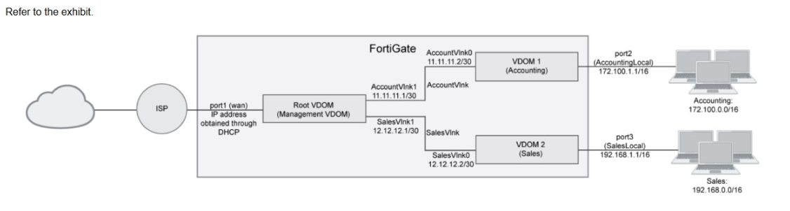 A customer has deployed a FortiGate 300E with virtual domains (VDOMs) enabled in the multi-VDOM mode. There are three VDOMs: Root is for management and internet access, while VDOM 1 and VDOM 2 are used for segregating internal traffic. AccountVlink and SalesVlink are standard VDOM links in Ethernet mode. Given the exhibit, which statement about VDOM behavior is correct? (Choose one answer)