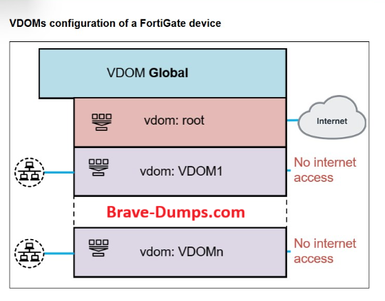 Refer to the exhibit. A FortiGate segmented into VDOMs is shown. You must ensure effective and accelerated internet access for all of the VDOMs in this enterprise network. How can you achieve this? (Choose one answer)