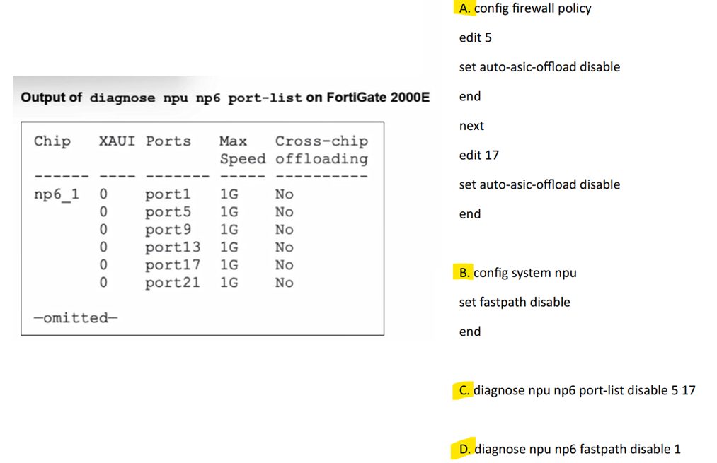5 and 17 in option A are for firewall policy ID, and we have no clue which source and destination interfaces are in those policies. Study Guide mention both options to disable Hardware Acceleration globally on NP6 are: -> diagnose npu <processor-name> fastpath disable <id> -> config system npu set fastpath disable end