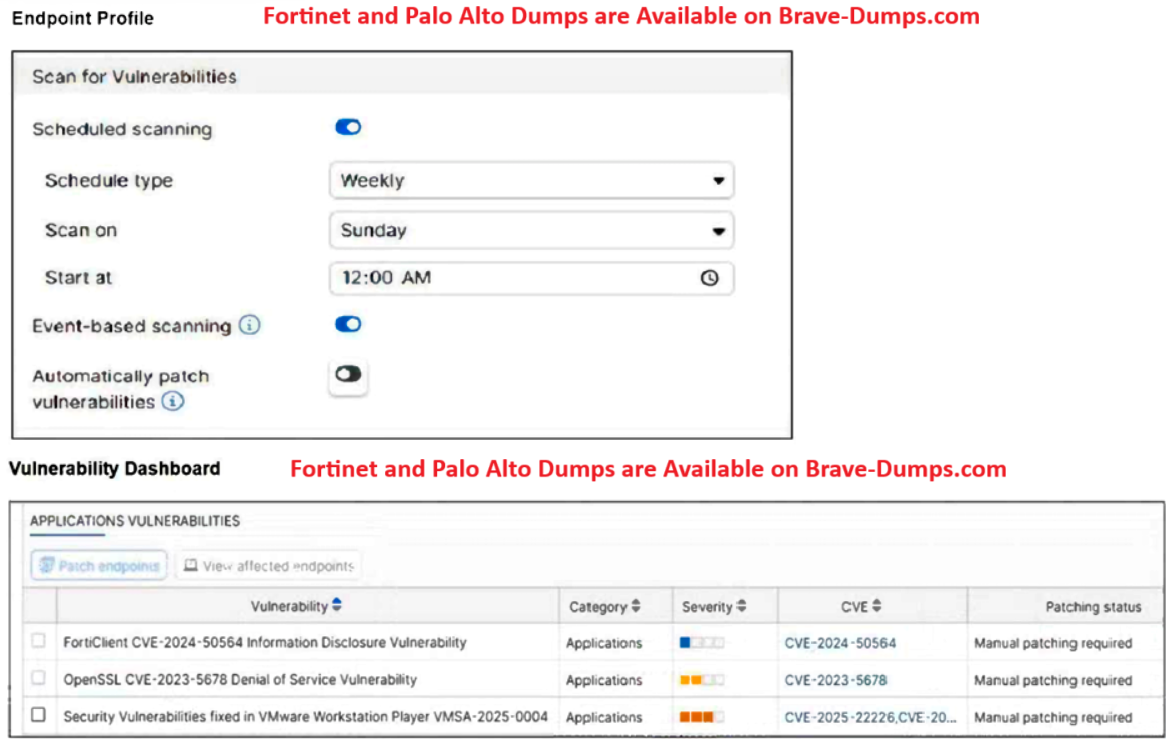 A vulnerability scan identifies vulnerabilities on the endpoint that should be fixed by installing software patches. You can view details about endpoint vulnerabilities on the Security dashboard on the FortiSASE portal. Any software patches that cannot be automatically installed are also listed. You should Manually download and install software patches for the vulnerable software.