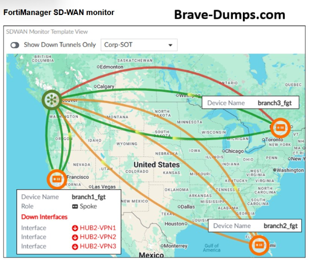 Refer to the exhibit. To check the status of an SD-WAN topology using the FortiManager SD-WAN monitor menus, you place your mouse next to branch1_fgt and receive the output shown in the exhibit. Which conclusion can you draw from the output shown in the exhibit? Note From Brave-Dumps: on the exam if asked to choose two answers please select A,C (Choose one answer)