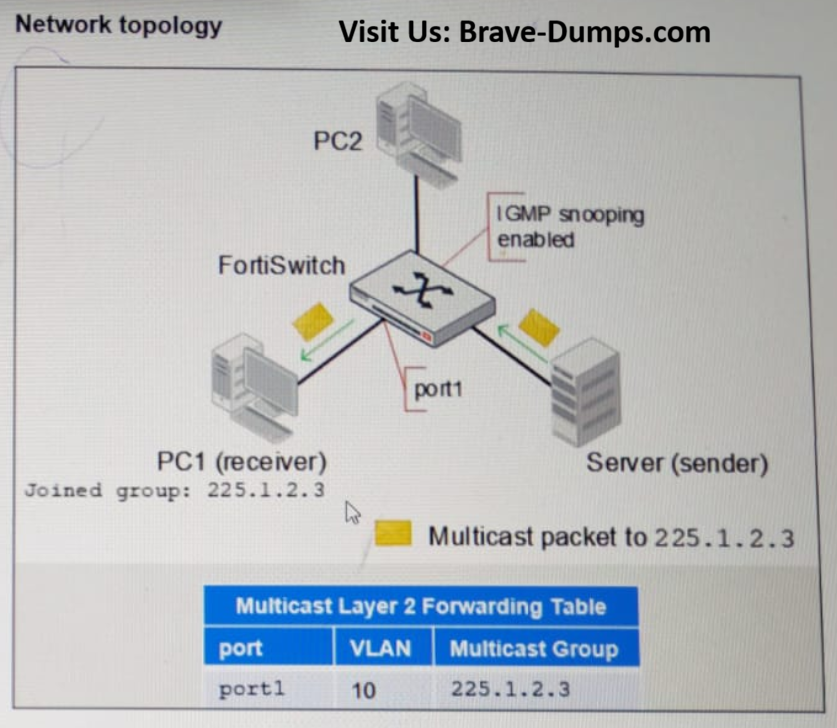 The topology on this slide shows three endpoints connected to FortiSwitch. All endpoints are placed in the same VLAN: VLAN 10. PC1, which is connected to port1 on FortiSwitch, has joined the multicast group 225.1.2.3. Because FortiSwitch has IGMP snooping enabled, FortiSwitch forwards the multicast traffic destined to 225.1.2.3, and sent by the server, to port1 only. If IGMP snooping were disabled, then PC2 would have also received a copy of the multicast traffic. (PAGE 253 FOR REFERENCE)