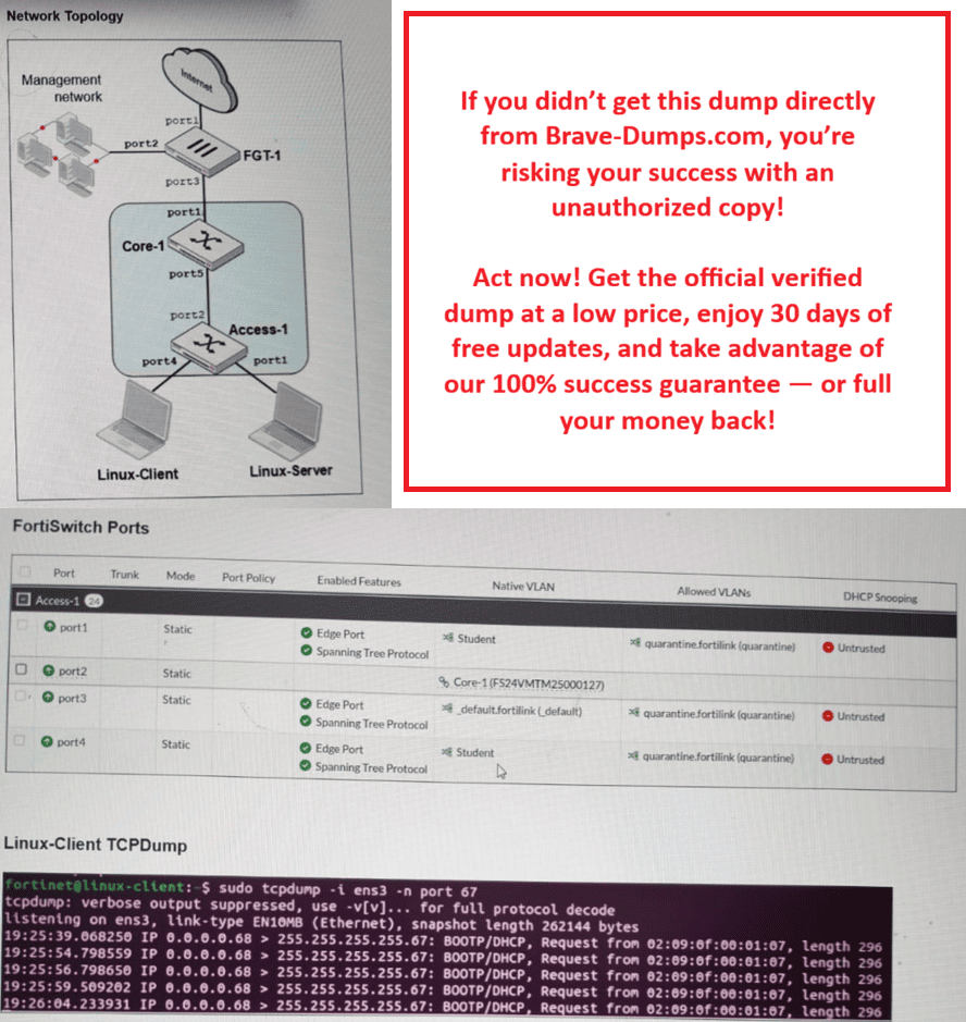 Option B is correct because the FortiSwitch configuration table explicitly shows that port1 is set to an untrusted state for DHCP snooping. In this specific network topology, the Linux-Server acting as the DHCP server is connected to port1. When DHCP snooping is enabled on a VLAN, the switch maintains security by only forwarding DHCP client requests to ports that have been explicitly configured as trusted. Because port1 is currently untrusted, the switch blocks the broadcast DHCP requests from reaching the server, which is why the tcpdump shows the requests leaving the client but the server receiving no traffic.