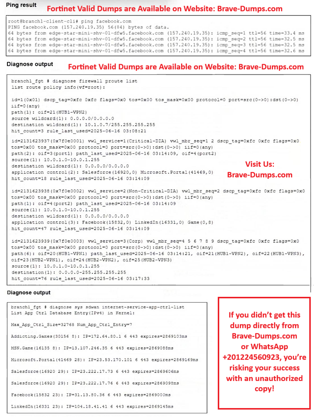 Refer to the exhibits. You connect to a device behind branch1_fgt, a branch FortiGate device, and initiate a ping test. The device is part of the LAN subnet and its IP address is 10.0.1.101. Based on the exhibits, which interface uses branch1_fgt to steer the test traffic? (Choose one answer)