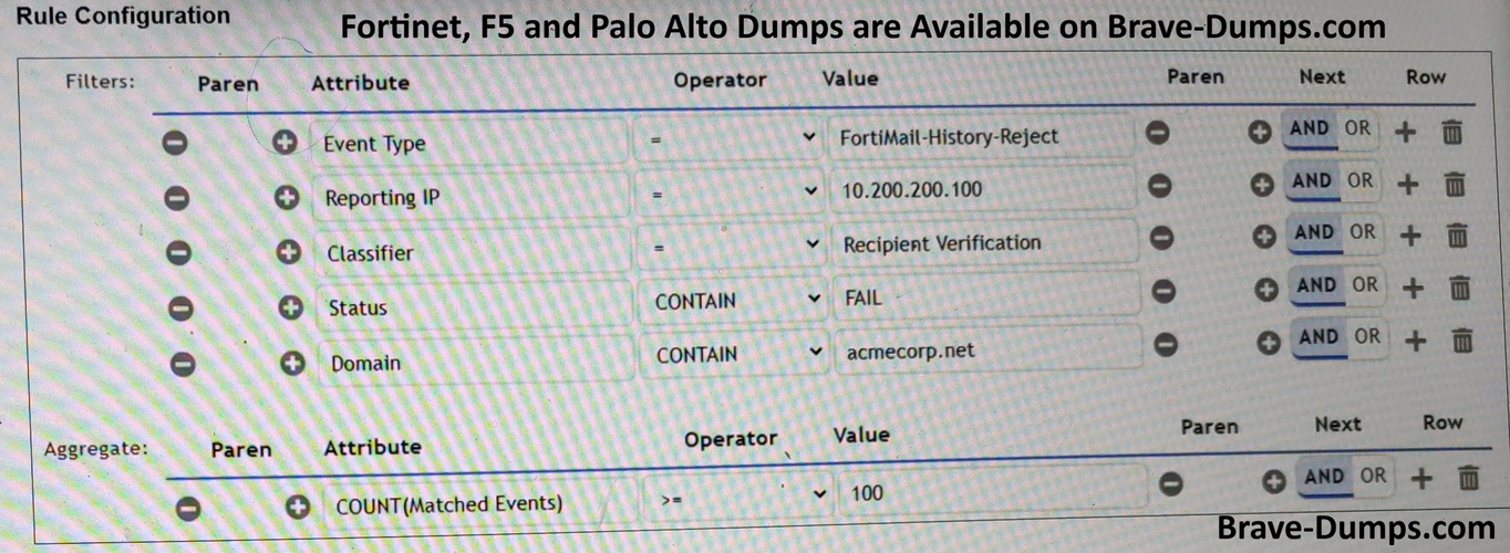 Refer to the exhibit. You want to configure a FortiSIEM rule that triggers when a FortiMail device reports at least 100 recipient verification failures for different email accounts in the domain acmecorp.net. What would you add or modify to accomplish this task? (Choose one answer)