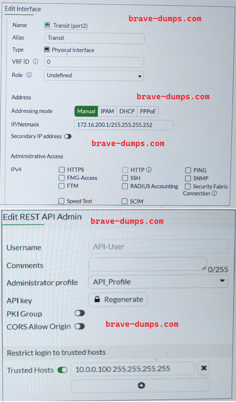 Refer to the exhibits. You configured the FortiGate connector on FortiSOAR. You want to allow FortiSOAR (10.200.200.160) to perform actions on FortiGate (172.16.200.1). However, the connection attempt fails. Assume that the FortiGate connector is configured correctly on the FortiSOAR side. Which two configurations are required on FortiGate? (Choose two answers)