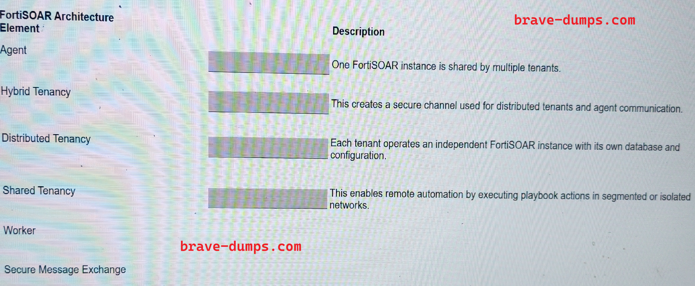 Match the FortiSOAR architecture element to its description. Select each FortiSOAR architecture element in the left column and drag and drop it into the blank space next to its corresponding description in the right column. After matching an element, you can move it again if you want to change your answer. You must match four elements with their descriptions in the work area. NOTE"This is a drag-and-drop question, so the answer options should not be available. Please check the correct answers inside the question rectangle instead." (Choose four answers)