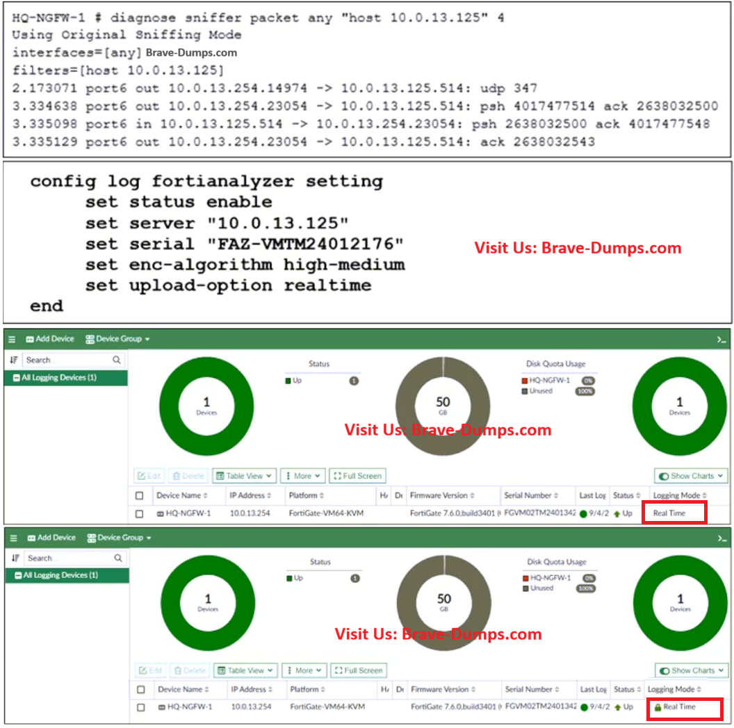The FortiGate device HQ-NGFW-1 with the IP address 10.0.13.254 sends logs to the FortiAnalyzer device with the IP address 10.0.13.125. The administrator wants to verify that reliable logging is enabled on HQ-NGFW-1. Which exhibit helps with the verification? (Choose one answer)