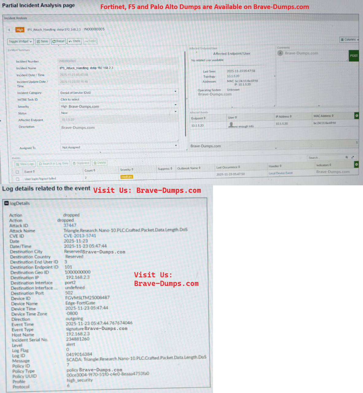 Refer to the exhibits. A partial Incident Analysis page and the log details related to the event are shown. An attack is reported on your OT network. You analyze the corresponding incident. Based on the information provided on the Incident Analysis page and the log details, which two statements are correct? (Choose two answers)