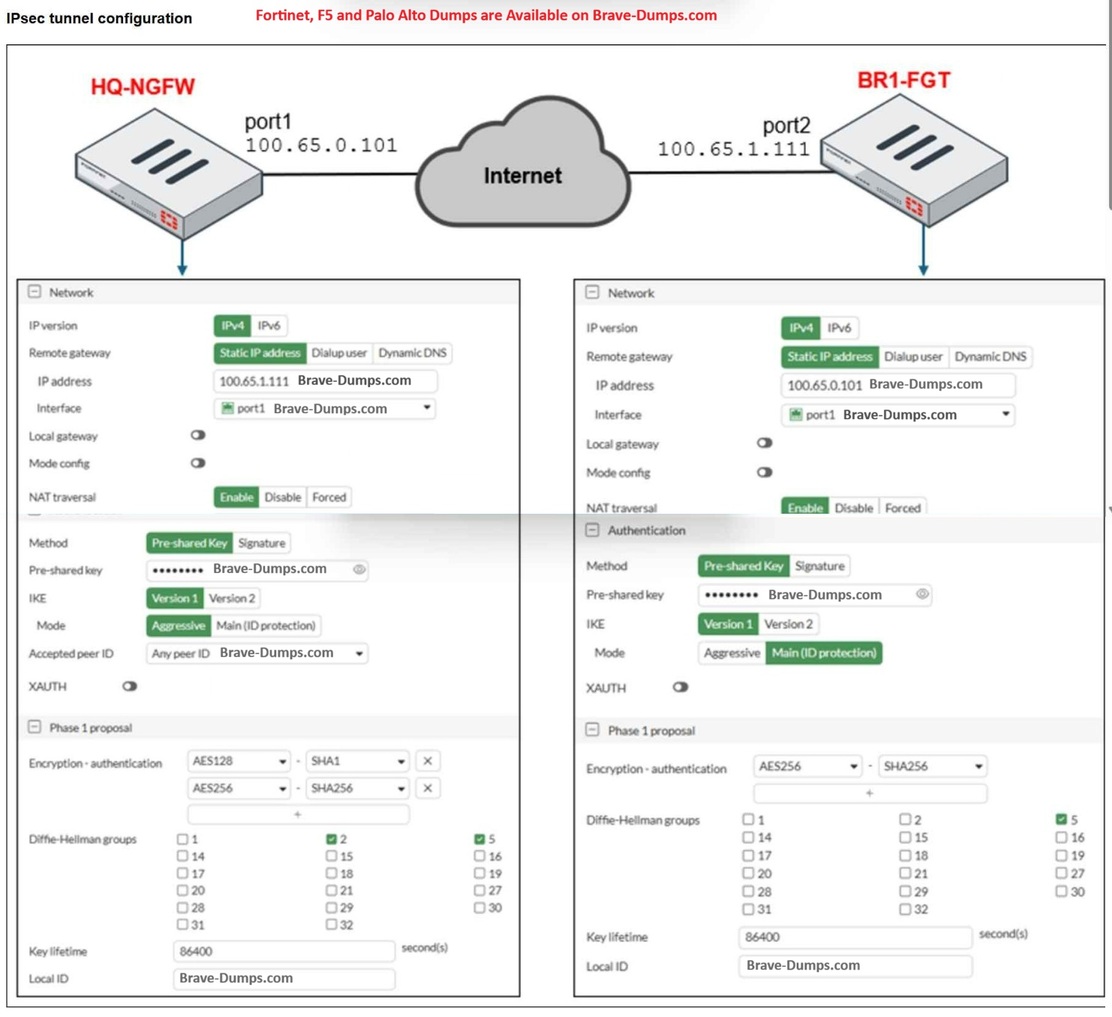 Refer to the exhibit. A network administrator is troubleshooting an IPsec tunnel between two FortiGate devices. The administrator has determined that phase 1 failed to come up. The administrator has also re-entered the pre-shared key on both FortiGate devices to make sure they match. Based on the phase 1 configuration and the diagram shown in the exhibit, which two configuration changes can the administrator make to bring phase 1 up? (Choose two answers)
