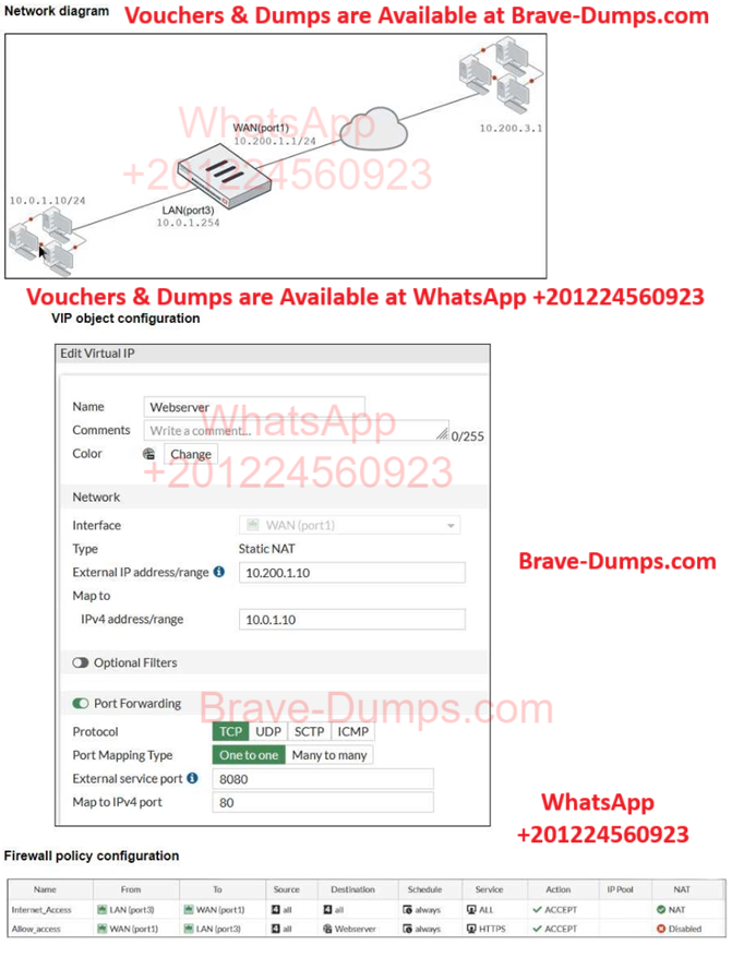 Refer to the exhibits, which show a diagram of a FortiGate device connected to the network. VIP object configuration, and the firewall policy configuration. The WAN (port1) interface has the IP address 10.200.1.1/24. The LAN (port3) interface has the IP address 10.0.1.254/24. If the host 10.200.3.1 sends a TCP SYN packet on port 8080 to 10.200.1.10, what will the source address, destination address, and destination port of the packet be at the time FortiGate forwards the packet to the destination? (Choose one answer)
