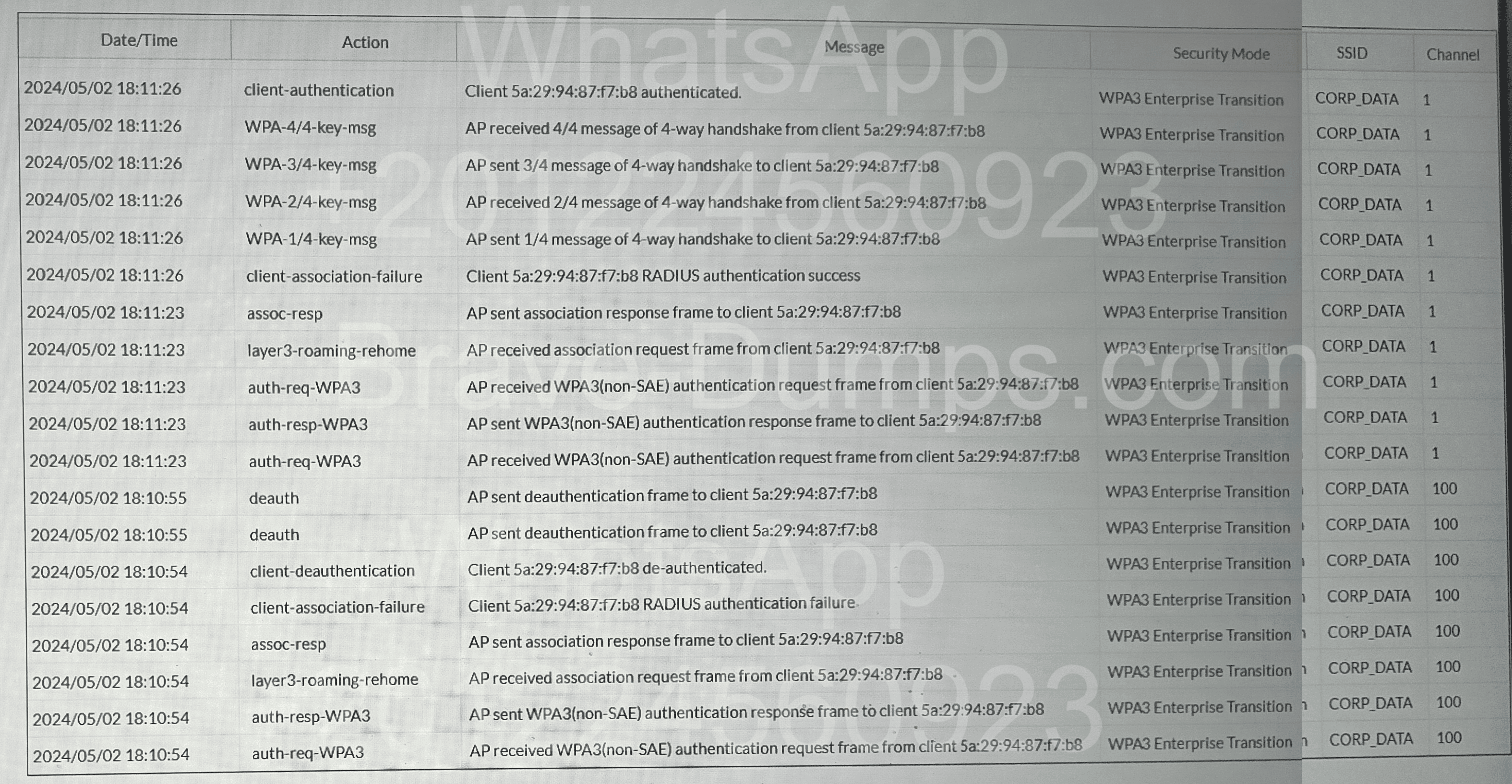 Refer to the exhibits. The wireless station with MAC address 5a:29:94:87:f7:b8 has made multiple attempts to connect to the CORP_DATA SSID. Despite client-association-failure event logs, the wireless station connects on the final attempt. Why did the wireless station fail to connect initially? (Choose one answer)