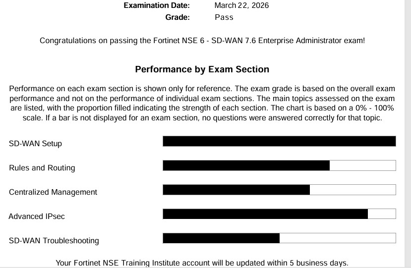 I passed the SD-WAN 7.6 Enterprise exam. the dump is 100% valid, but the report is not good enough as shown below, my advice to all, you have two options , depen on the answers provided by the admin, or change the answers only if you are 100% sure. If you are not sure, depend on the website answers and you will pass, good luck to everyone, and special thanks to the BraveDumps team.