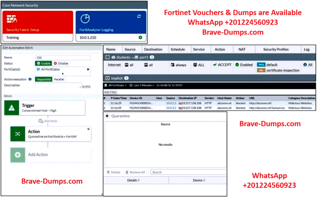 After trying to access a malicious website from the test device, the administrator verifies that FortiAnalyzer has a log for the test connection. However, the device is not getting quarantined by FortiGate, as shown in the quarantine widget.