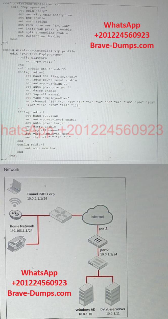 The CLI output shows a FortiGate configuration supporting a remote AP in an employee's home. The employee requires access to resources located on the company network, including the database server and AD server. The employee is trying to print to a printer connected in their home, but is not able to.