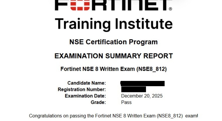 - 100% Score in the Real Fortinet NSE 8 - Writtent Exam (NSE8_812 Exam) at the Pearson VUE Testing Center