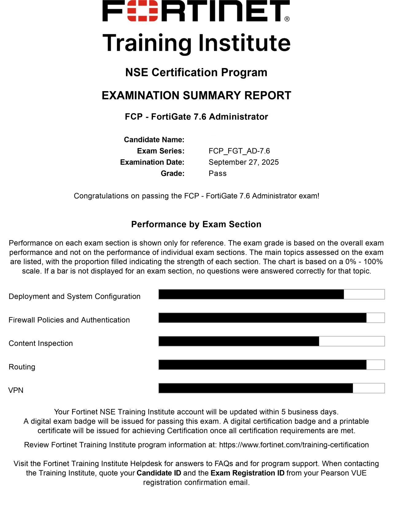 ● 100% Score in the Real Fortinet NSE 4 - FortiOS 7.6 Exam (NSE4_FGT_AD-7.6 exam) at the Pearson VUE Testing Center.