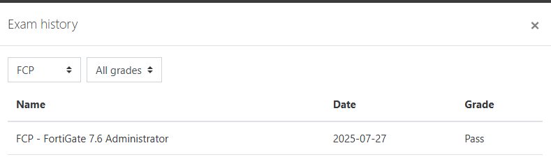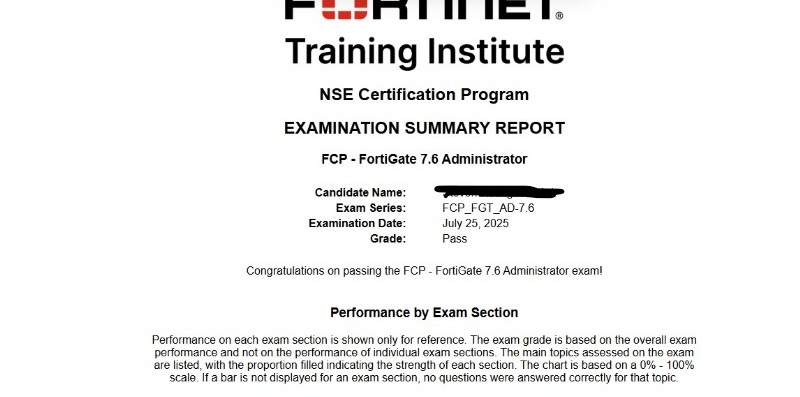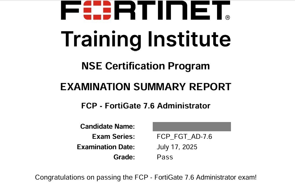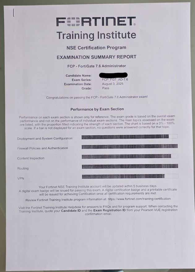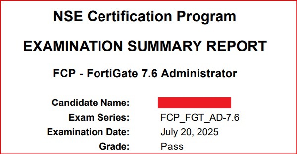 ● 100% Score in the Real Fortinet NSE 4 - FortiOS 7.6 Exam (NSE4_FGT_AD-7.6 exam) at the Pearson VUE Testing Center.