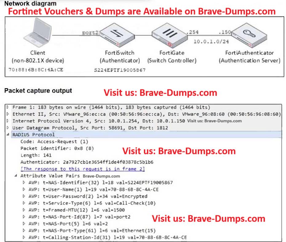 During packet capture analysis, a RADIUS Access-Request packet was detected being sent from FortiSwitch to FortiAuthenticator and passing through FortiGate. The capture shows that the User-Name attribute in the RADIUS Access-Request packet contains the client MAC address.