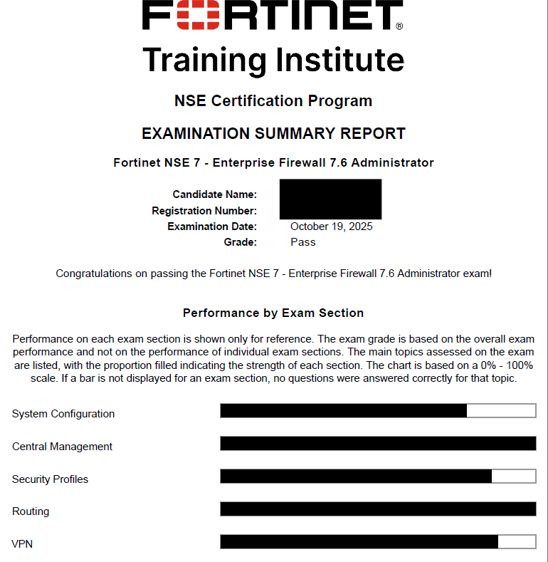 100% score in the Real NSE 7 - Enterprise Firewall 7.6 Administrator Exam (EFW_AD-7.6) at the Pearson VUE Testing Center