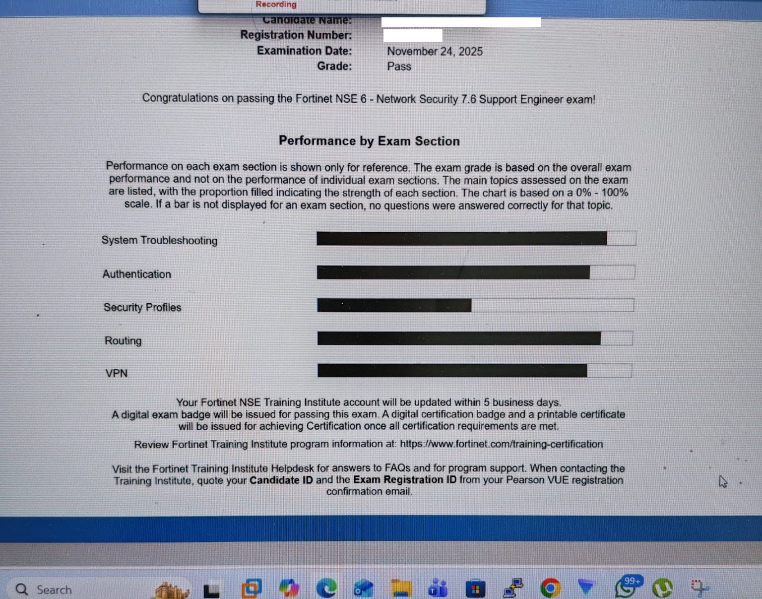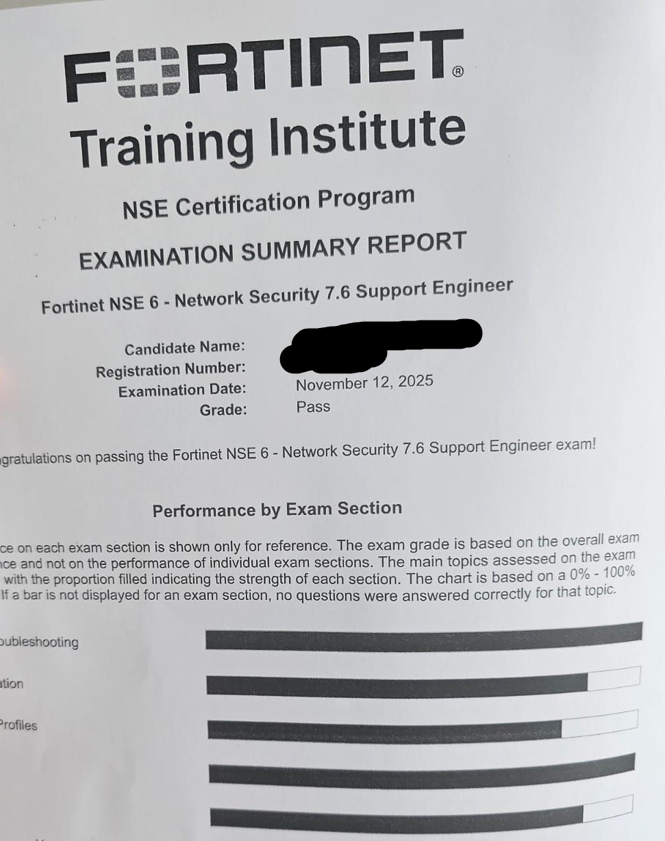 100% Score in the Real Network Security 7.6 Support Engineer (FCSS_NST_SE-7.6 Exam) at the Pearson VUE Testing Center