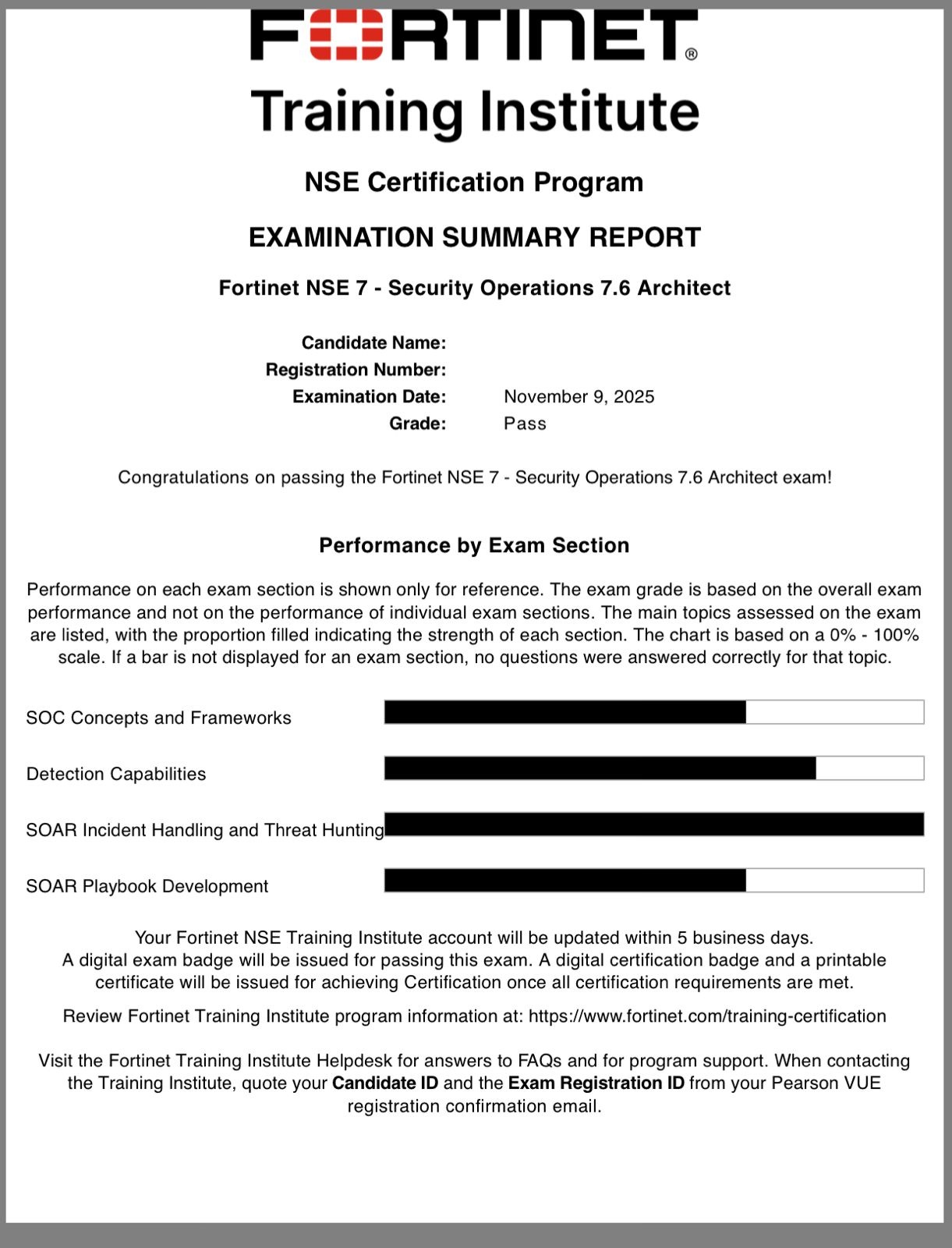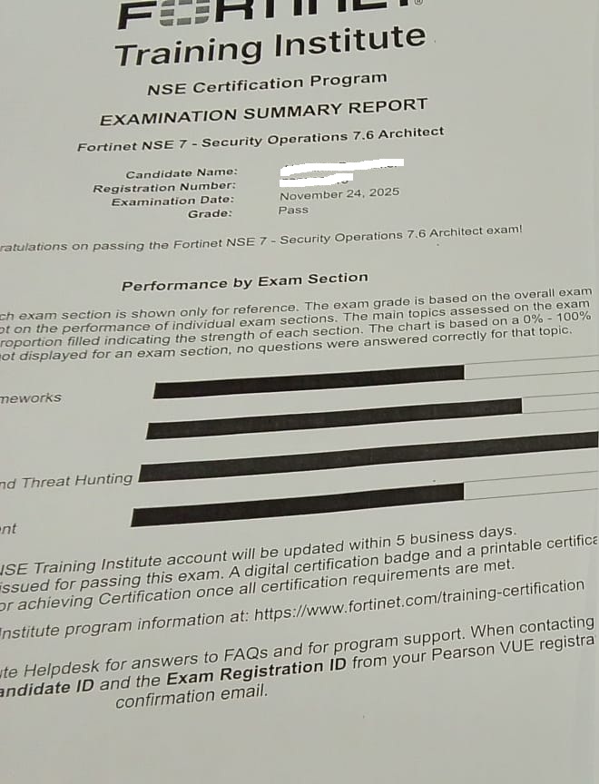 100% Score in the Real NSE 7 - Security Operations 7.6 Architect Exam (NSE7_SOC_AR-7.6 Exam) at the Pearson VUE Testing Center