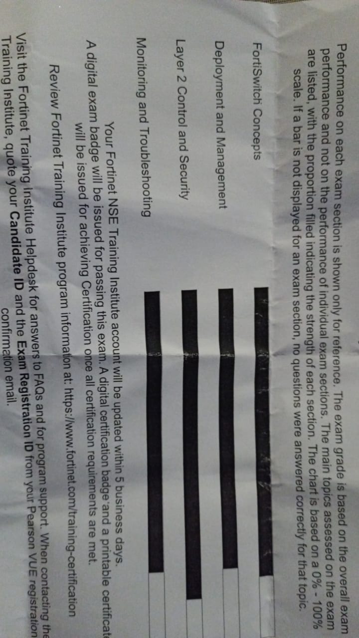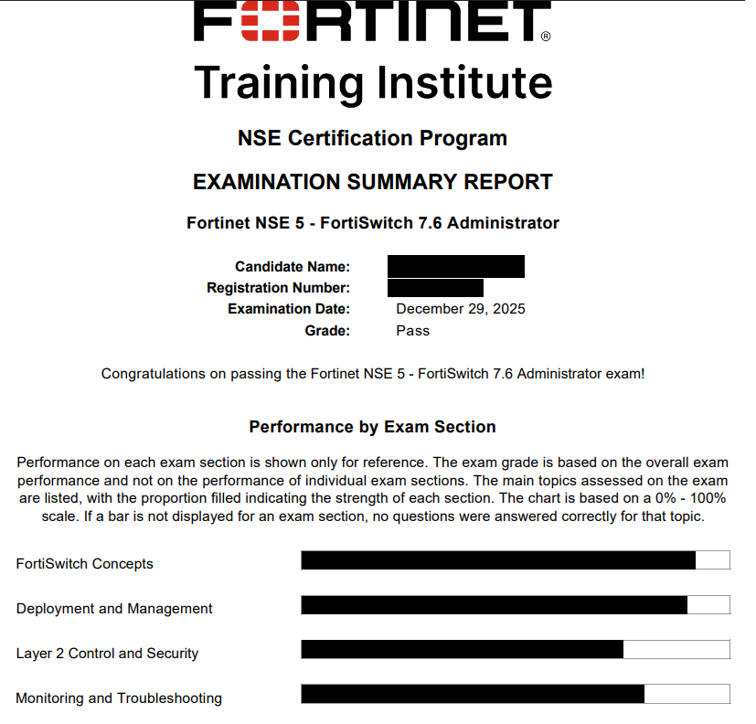 100% Score in the Real NSE 5 - FortiSwitch 7.6 Administrator Exam (NSE5_FSW_AD-7.6 Exam) at the Pearson VUE Testing Center