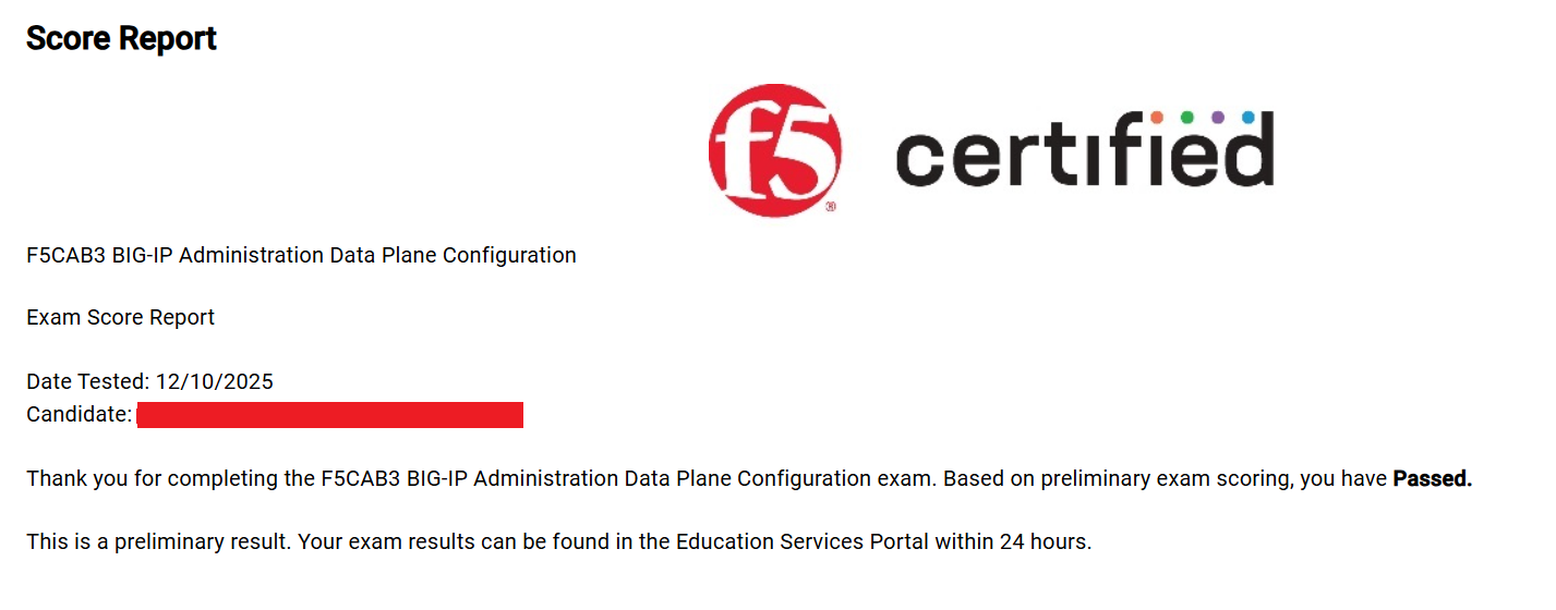 ● 100% Score in the Real BIG-IP Administration Data Plane Configuration Exam (F5CAB3 Exam) at the Testing Center