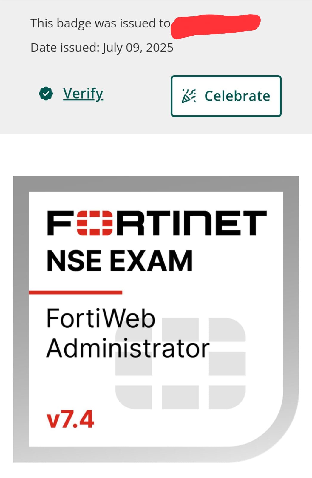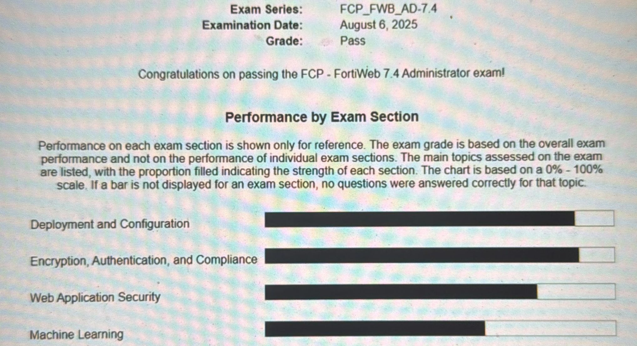 ● 100% Score in the Real NSE 5 - FortiWeb 7.4 Administrator (FWB_AD-7.4 Exam) at the Pearson VUE Testing Center.