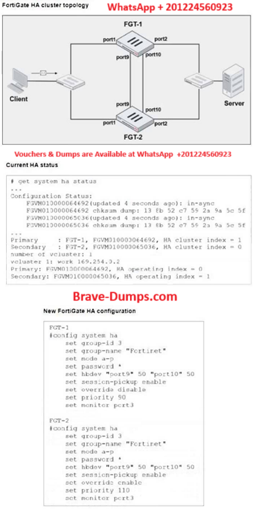 FGT-1 and FGT-2 are updated with HA configuration commands shown in the exhibit.