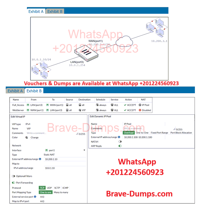The exhibits contain a network diagram, and virtual IP, IP pool, and firewall policies configuration information.