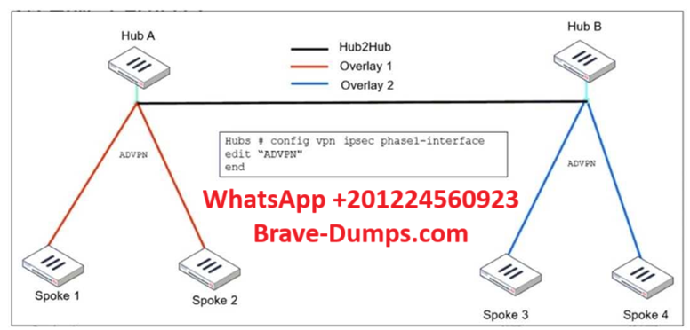 Refer to the exhibit, which shows the ADVPN IPsec interface representing the VPN IPsec phase 1 from Hub A to Spoke 1 and Spoke 2, and from Hub B to Spoke 3 and Spoke 4. An administrator must configure an ADVPN using IBGP and EBGP to connect overlay network 1 with2. What must the administrator configure in the phase 1 VPN IPsec configuration of the ADVPN tunnels? (Choose one answer)