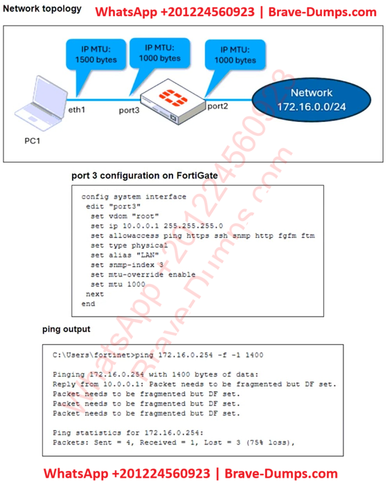 Refer to the exhibits. The configuration of a user's Windows PC, which has a default MTU of 1500 bytes, along with FortiGate interfaces set to an MTU of 1000 bytes, and the results of PC1 pinging server 172.16.0.254 are shown. Why is the user in Windows PC1 unable to ping server 172.16.0.254 and is seeing the message: Packet needs to be fragmented but DF set? (Choose one answer)