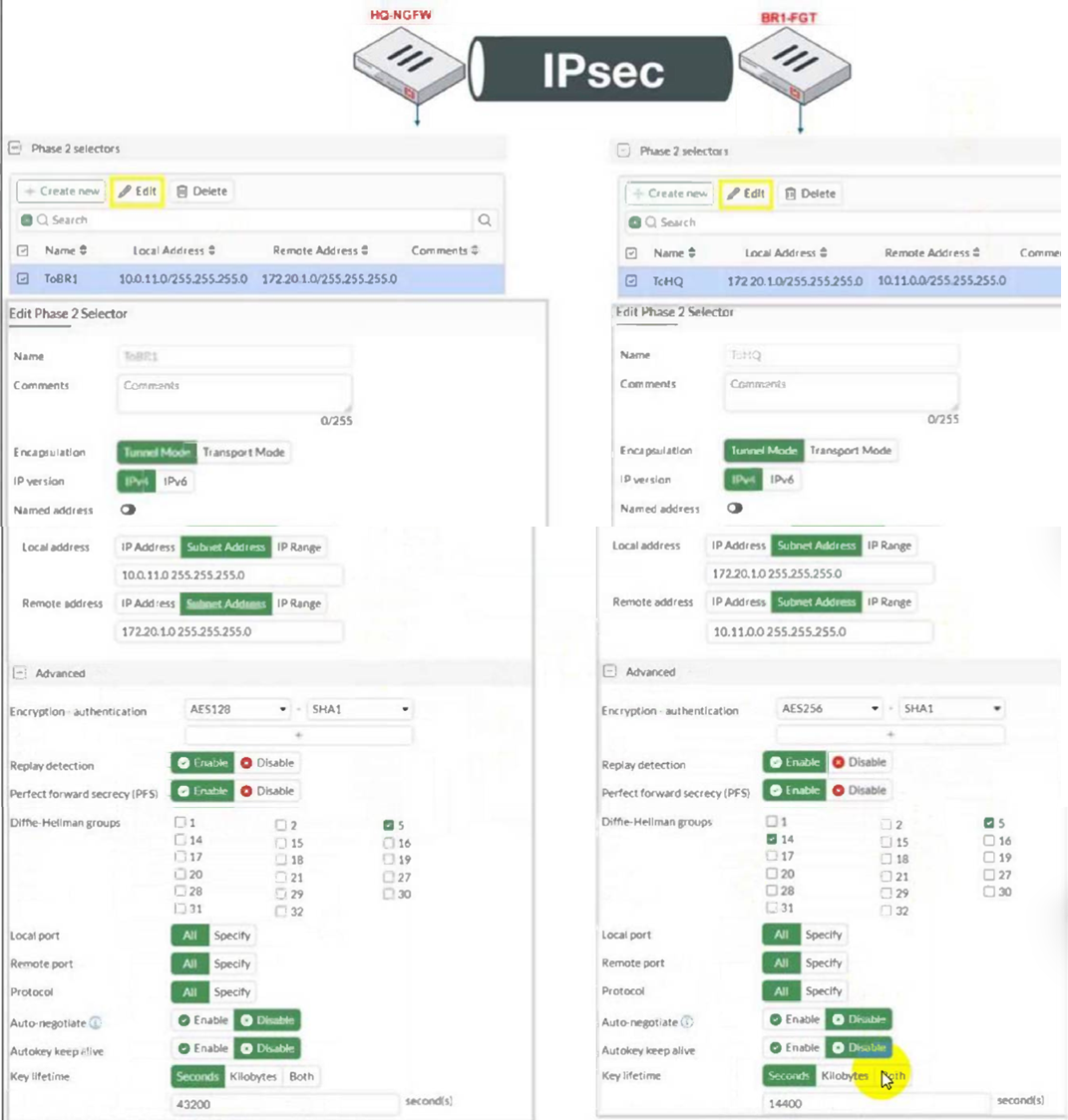 Refer to the exhibit. A network administrator is troubleshooting an IPsec tunnel between two FortiGate devices. The administrator has determined that phase 1 status is up, but phase 2 fails to come up. Based on the phase 2 configuration shown in the exhibit, which two configuration changes will bring phase 2 up? (Choose two answers)