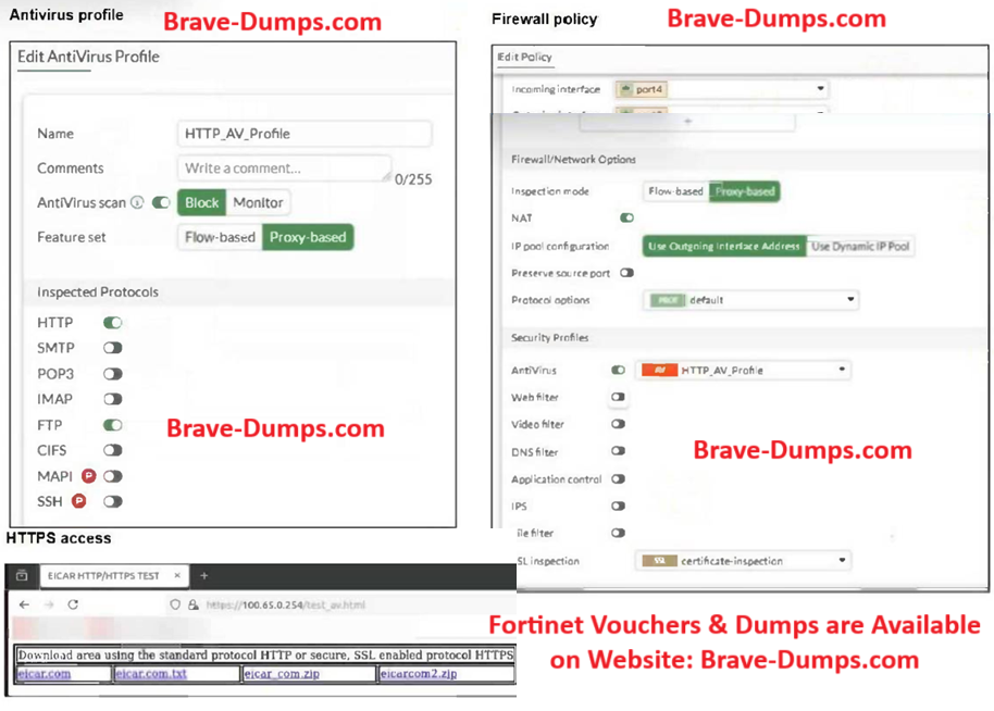 Refer to the exhibit. You are asked to implement an antivirus profile for files downloaded through FTP, HTTP, and HTTPS. While testing, you are successful with HTTP and FTP protocols, but FortiGate does not block the file download over HTTPS. What could be the cause? (Choose one answer)