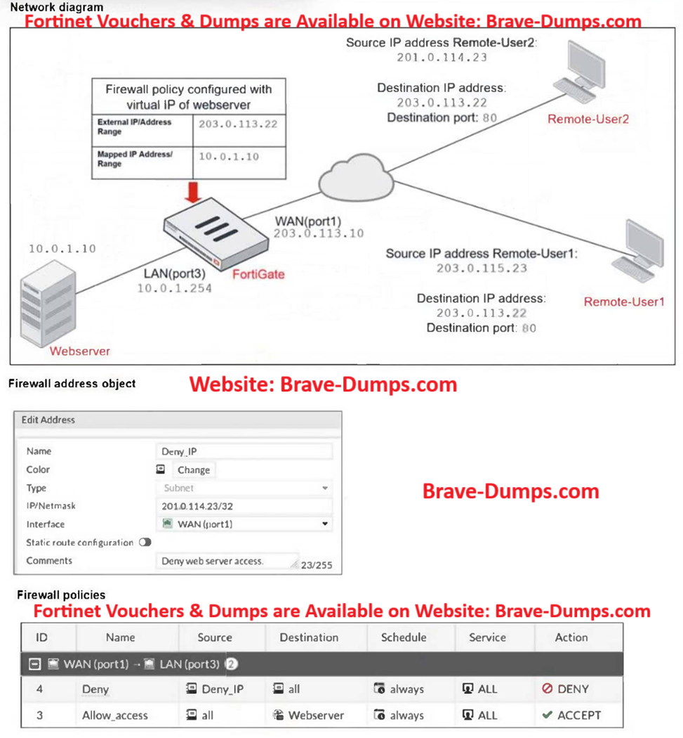 Refer to the exhibits. The exhibits show a diagram of a FortiGate device connected to the network, and the firewall configuration. An administrator created a Deny policy with default settings to deny Webserver access for Remote-User2. The policy should work such that Remote-User1 must be able to access the Webserver while preventing Remote-User2 from accessing the Webserver. Which additional configuration can the administrator add to a deny firewall policy, beyond the default behavior, to block Remote-User2 from accessing the Webserver? (Choose one answer)