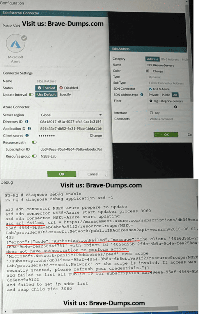 Refer to the exhibits. The exhibits show the configuration and debug output from a FortiGate Public SDN Connector. What is a possible reason for this dynamic address object to be empty? (Choose one answer)