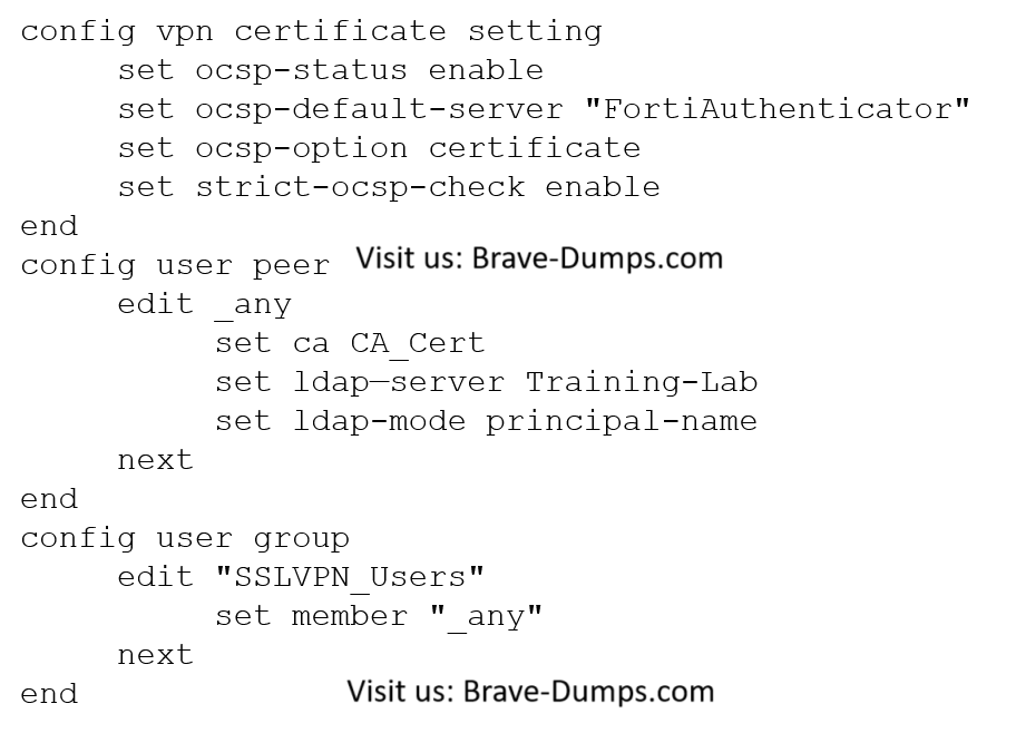 An administrator has configured a FortiGate device to authenticate SSL VPN users using dogotal certificates. A FortiAuthenticator is the certificate authority (CA) and the Online Certificate Status Protocol (OCSP) server. Part of the FortiGate configuration is shown below: Based on this configuration, which two statements are true? (Choose two answers)
