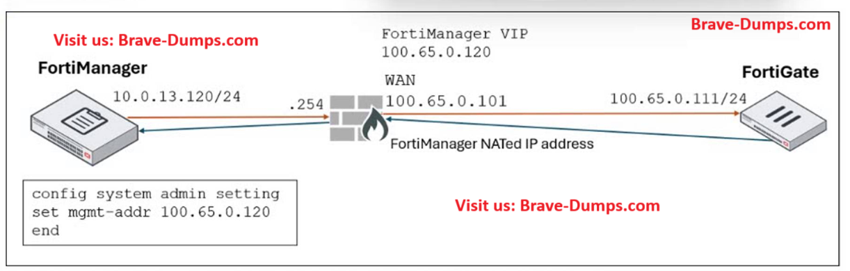 Refer to the exhibits. An administrator must add a FortiGate device to FortiManager using the discovery process. FortiManager is operating behind a network address translation (NAT) device, and the administrator configured the FortiManager NATed IP address under the FortiManager system administration settings. What is the expected result during discovery? (Choose one answer)