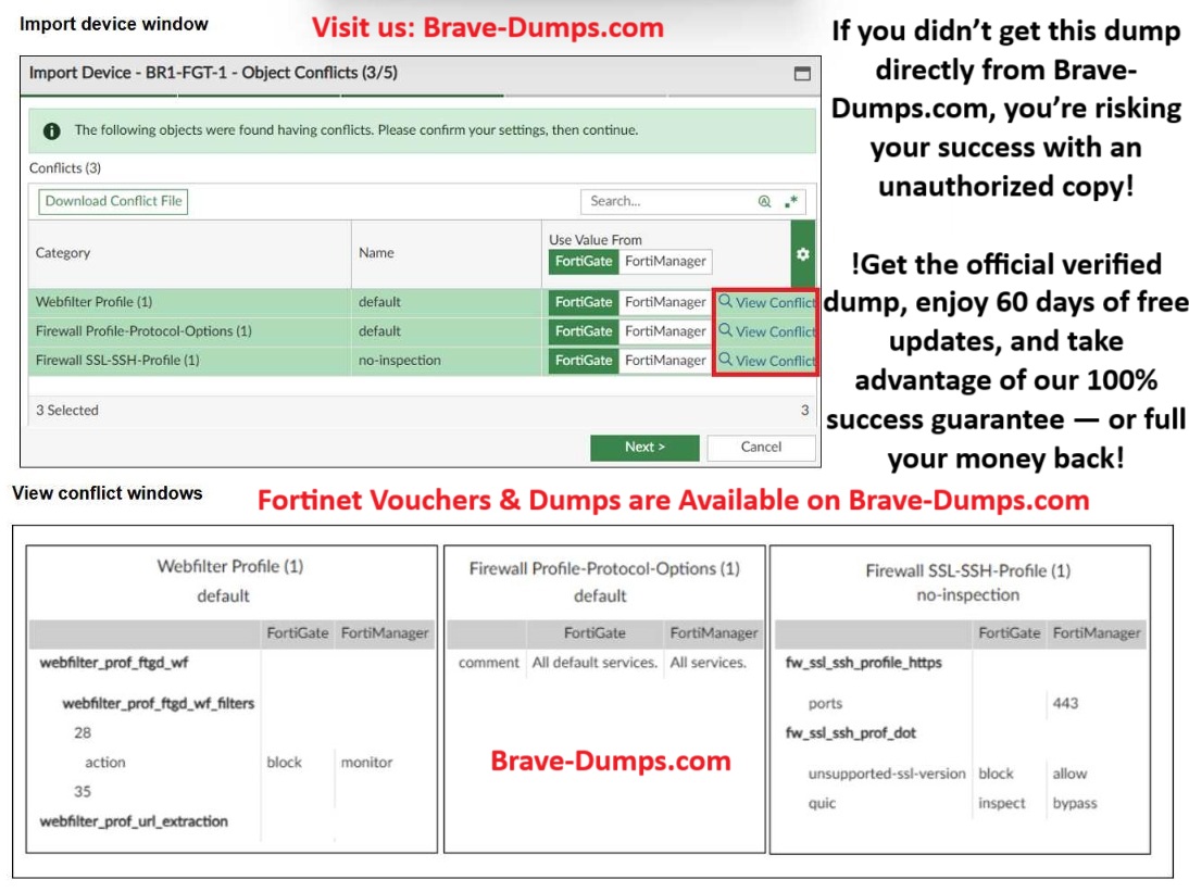 An administrator added BR1-FGT-1 to FortiManager and started importing the policy package. During the process, they saw that they need to choose values from FortiGate or FortiManager. Which conclusion is most clearly supported by the exhibits? (Choose one answer)