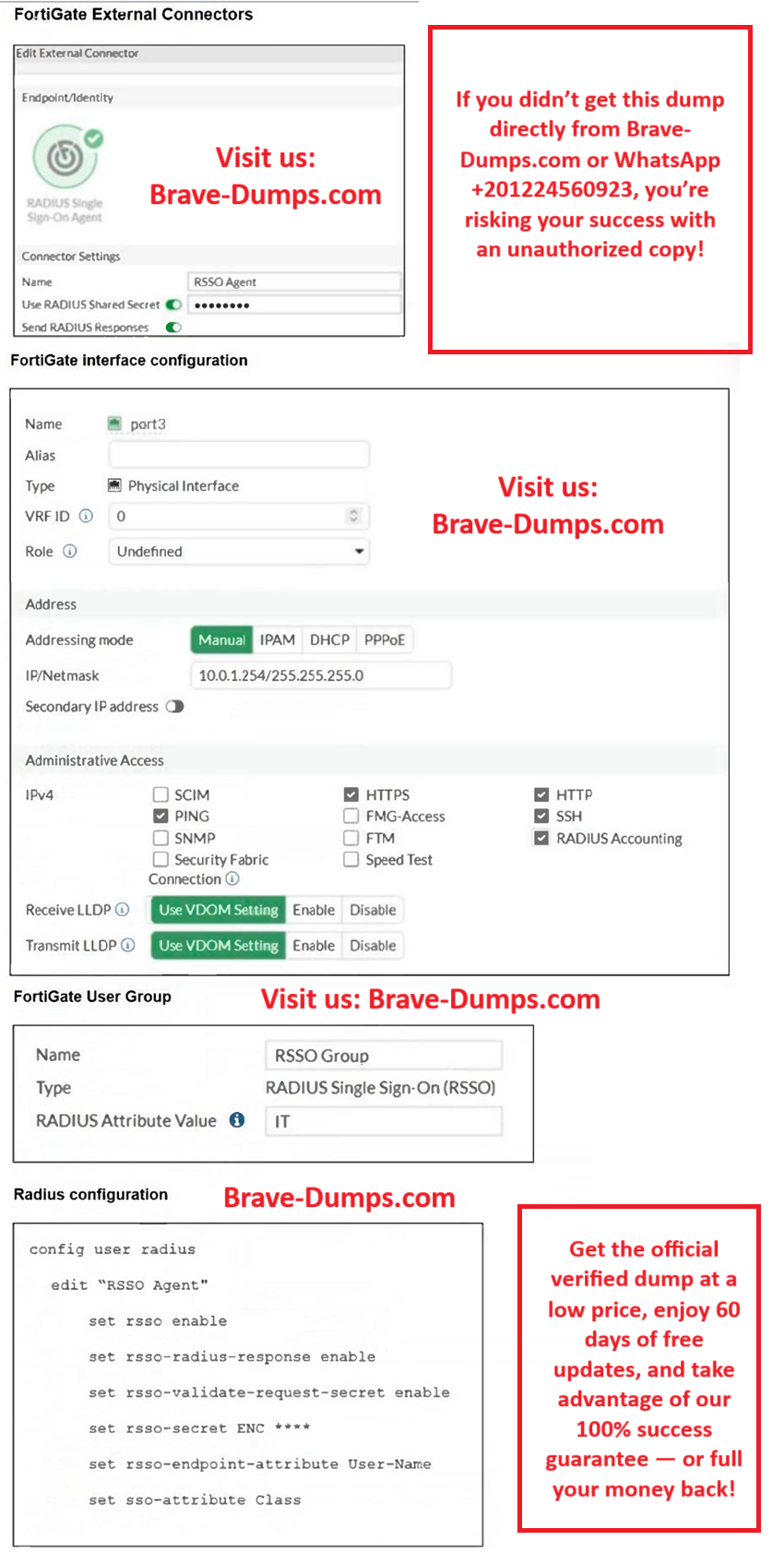 Refer to the exhibits. A network administrator is configuring RADIUS single sign-on (RSSO) on FortiGate to dynamically assign users to specific user groups based on RADIUS accounting messages. Which two configuration steps are required to ensure RSSO user group matching works correctly? (Choose two answers)