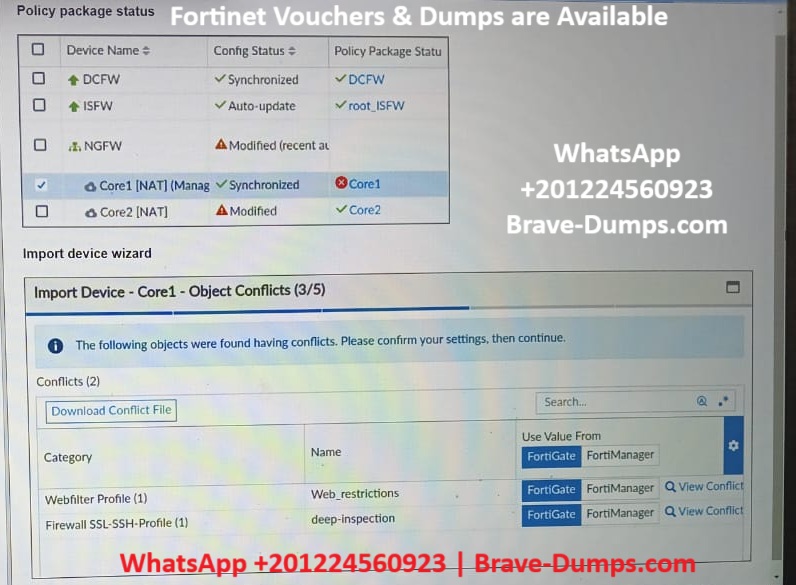 Refer to the exhibits. A policy package conflict status and information from the import device wizard in the Core1 VDOM are shown. When you import a policy package, the following message appears for the Web_restrictions web filter profile and the deep-inspection SSL-SSH profile: The following objects were found having conflicts. Please confirm your settings, then continue. The Web_restrictions and deep-inspection profiles are used by other FortiGate devices within FortiManager. Which step must you take to resolve the issue? (Choose one answer)