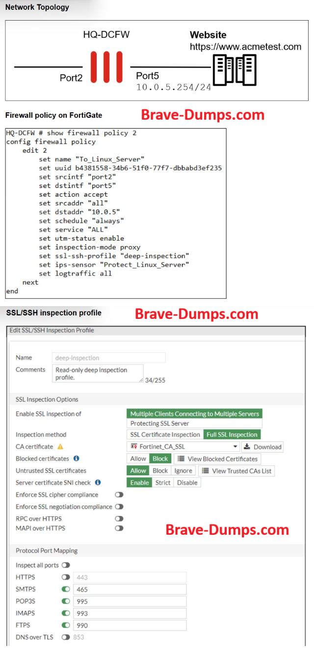 Refer to the exhibits. A network topology, firewall policy, and SSL/SSH inspection profile configuration are shown. What must you configure on firewall policy ID 2 to detect HTTPS attacks that target a Linux server hosting the website www.acmetest.com? (Choose one answer)